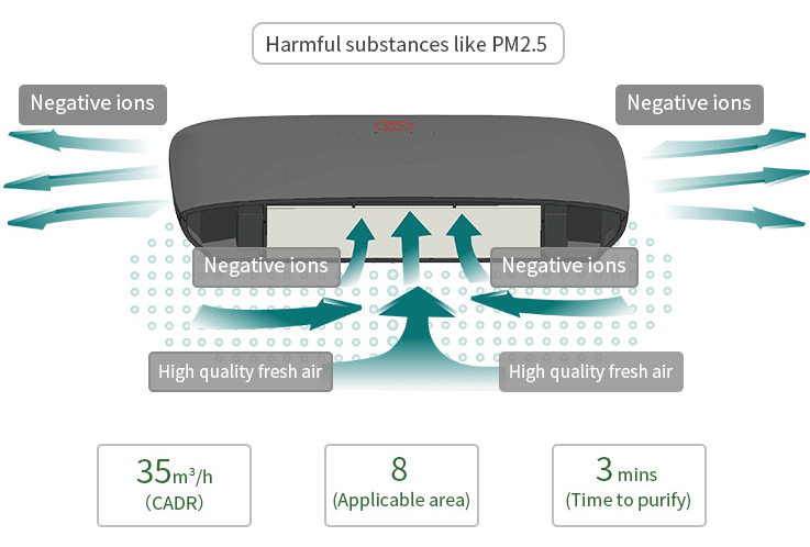 یون منفی(Ion generator): تولید یون منفی اکسیژن برای تنفس هوایی سرشار از اکسیژن، که با همراهی تکنولوژی پلاسما کلاستر(Plasma cluster) گازهای خطرناک مانند بنزن، فرمالدئید، باکتریهای بیماریزا و عوامل آلرژن را از میان میبرد و در خنثی نمودن بوهای منتشر شده در هوا موثر است. تکنولوژی بالای (Coanda etfect) نیز در دستگاه CS-828 به کار رفته که تاثیر ضد باکتری و آلرژن پلاسما کلاستر را به نحو چشمگیری افزایش می دهد و باعث پاکی یکسان تمامی بخشهای اتومبیل می گردد.